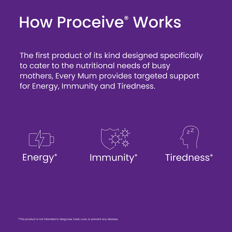 Understanding the unique demands placed on mothers, Proceive® Every Mum is scientifically formulated to address the specific needs of mothers, with a focus on providing essential nutrients for energy, combating tiredness, and supporting immunity.