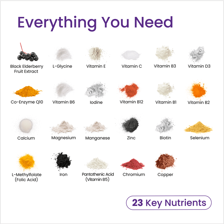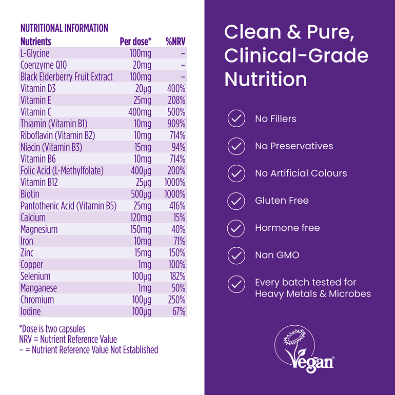 INGREDIENTS: Ascorbic Acid (Vitamin C), Calcium Carbonate (Calcium), Magnesium Oxide (Magnesium), Capsule Shell (Hydroxypropyl Methylcellulose), L-Glycine, Black Elderberry Fruit Extract 30% Polyphenols, DL-Alpha Tocopheryl Acetate (Vitamin E), Ferrous Bis-Glycinate (Iron), Calcium Pantothenate (Vitamin B5), Sodium Selenite (Selenium), Coenzyme Q10 (Ubiquinone), Zinc Oxide (Zinc), Nicotinamide (Vitamin B3), Thiamine Hydrochloride (Vitamin B1), Pyridoxine HCl (Vitamin B6), Riboflavin (Vitamin B2), Cholecalciferol (Vitamin D3) (Vegan), Copper Sulphate Pentahydrate (Copper), Manganese Sulphate (Manganese), Chromium Picolinate (Chromium), L-Methylfolate (Folic acid), D-Biotin (Biotin), Potassium Iodide (Iodine), Methylcobalamin (Vitamin B12), Anti Caking Agent: Silicon Dioxide, Anti Caking Agent: Magnesium Stearate).