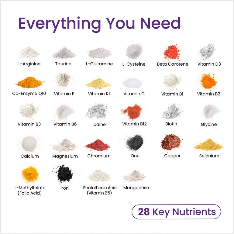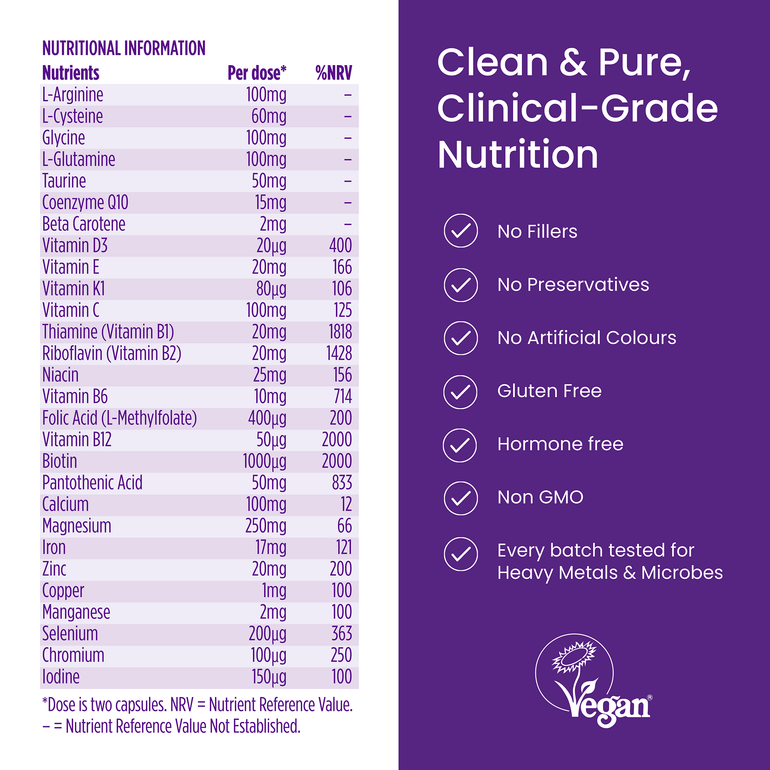 INGREDIENTS: Magnesium Oxide, Calcium Carbonate, L-Arginine, L-Glutamine, L-Glycine, Ascorbic Acid (Vitamin C), L-Cysteine, Calcium D-Pantothenate (Vitamin B5), Taurine, Sodium Selenite, DL-α-Tocopheryl Acetate (Vitamin E), Thiamine Mononitrate (Vitamin B1), Nicotinamide (Vitamin B3), Zinc Oxide, Riboflavin (Vitamin B2), Iron, Ubiquinone (CoEnzyme Q10), Pyridoxine HCI (Vitamin B6), Beta Carotene, Cholecalciferol (Vitamin D3), Manganese Sulphate, Methylcobalamin (Vitamin B12), Cupric Sulphate, Biotin, Chromium (Picolinate), Calcium L-Methylfolate (Folic Acid), Phylloquinone (Vitamin K1), Potassium Iodide (Iodine). Capsule Shell: Hydroxypropyl Methylcellulose. Anti Caking Agents: Magnesium Stearate, Silica.