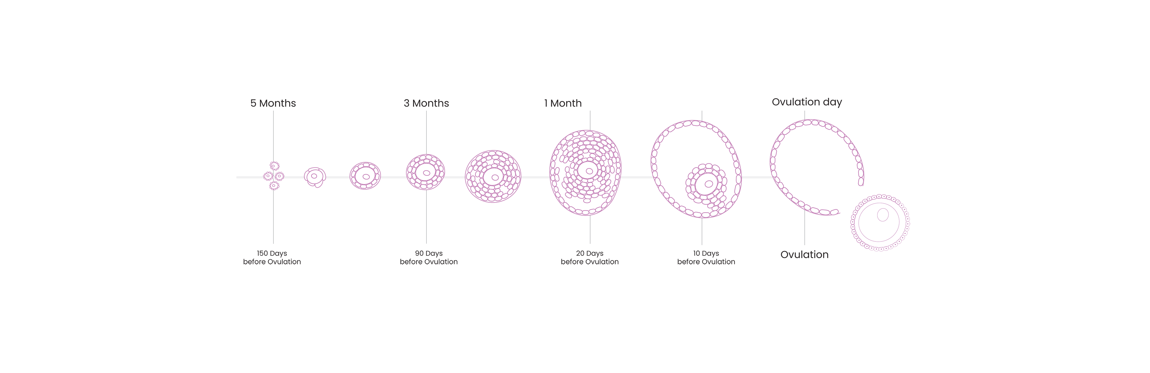 As you can see from the diagram below, it takes approximately 90 - 120 days for the egg to develop from a tiny follicle to a mature egg ready for ovulation. The ovaries will contain follicles at every stage of development at any given time.
