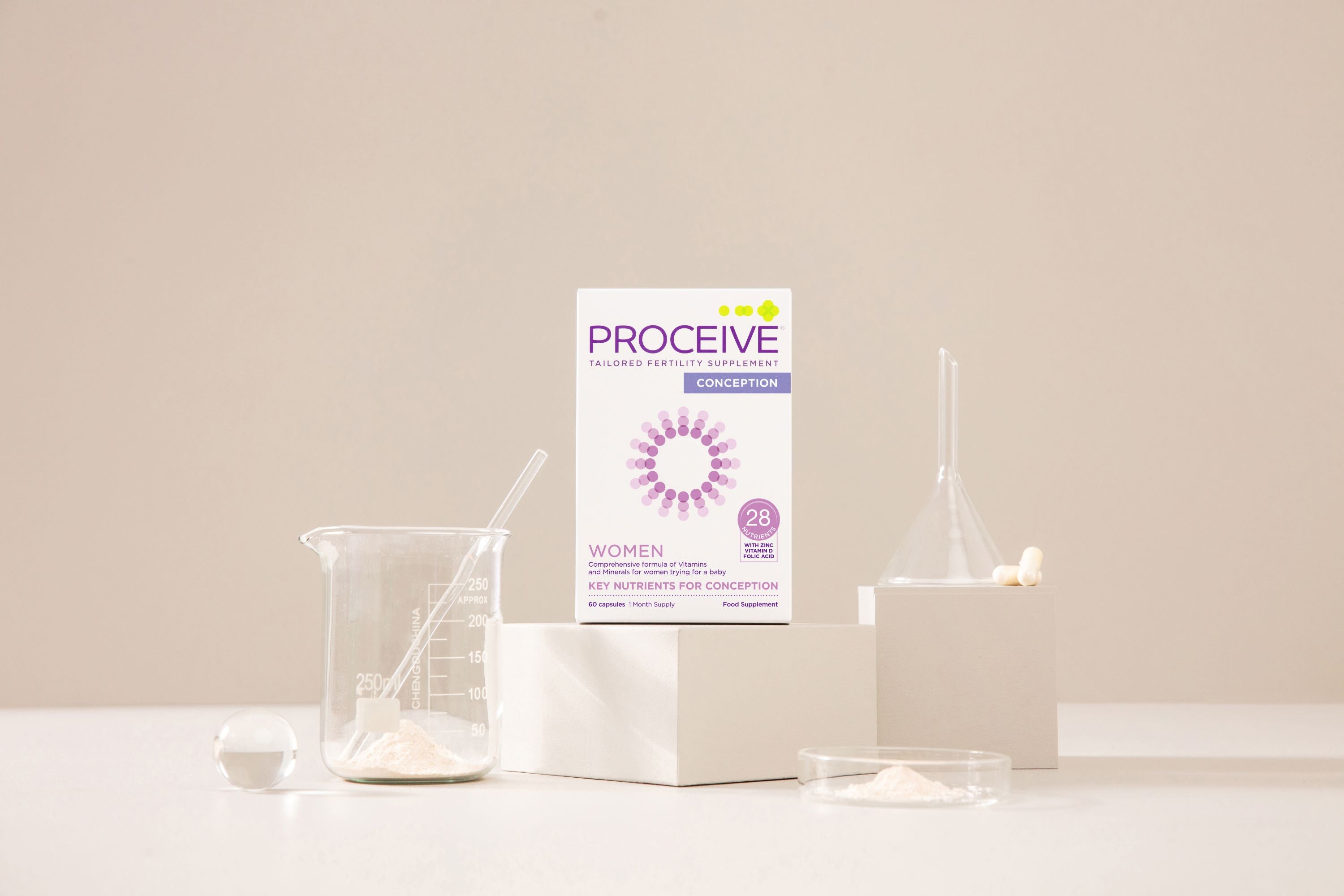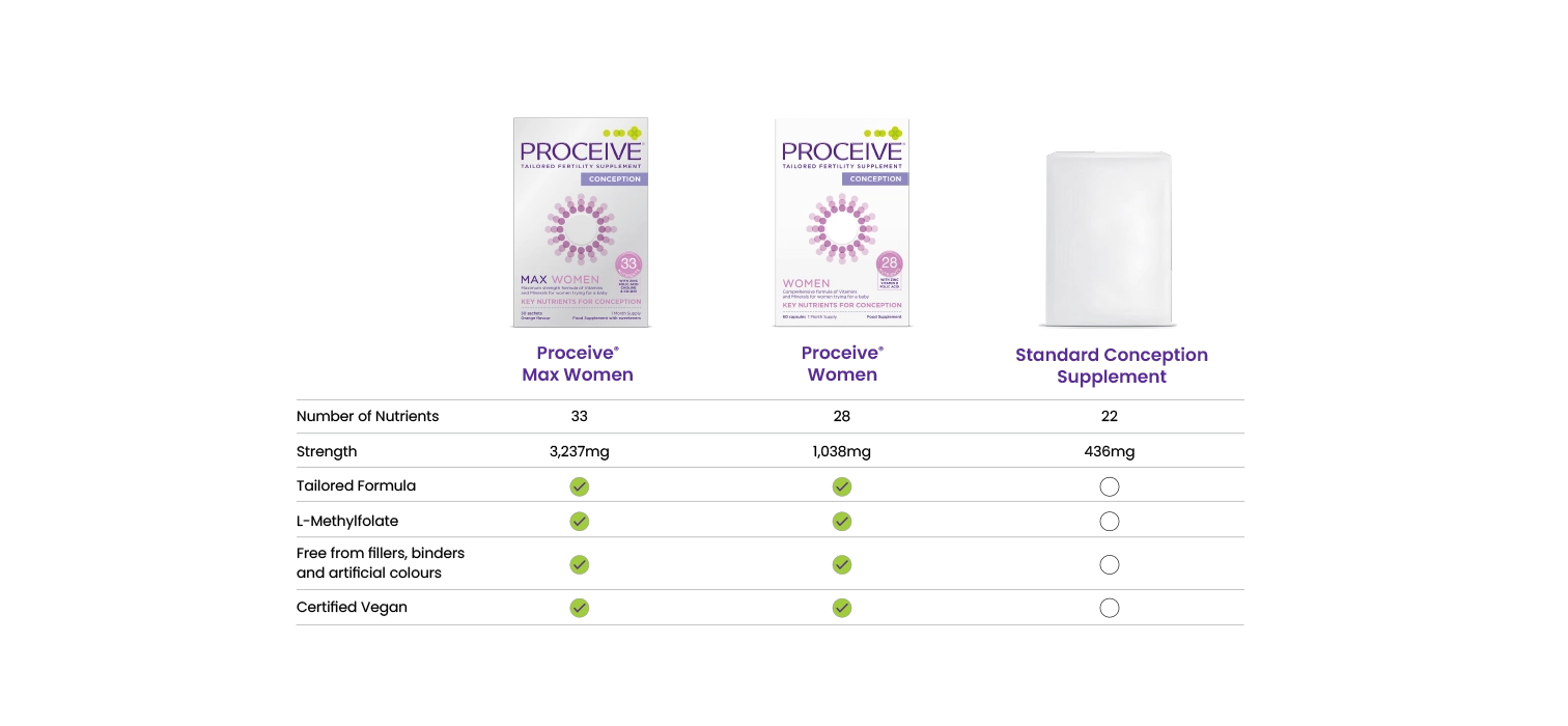 Nutrients play an important role in the development of the egg, womb and the hormonal system. Many of these processes use nutrients. A healthy lifestyle, a balanced diet and taking enough exercise are important when trying for a baby. It can be difficult to get all the nutrients you need from your diet in today’s busy world. This is where Proceive® Women may help by providing the extra support needed to support good pre-conception health.
