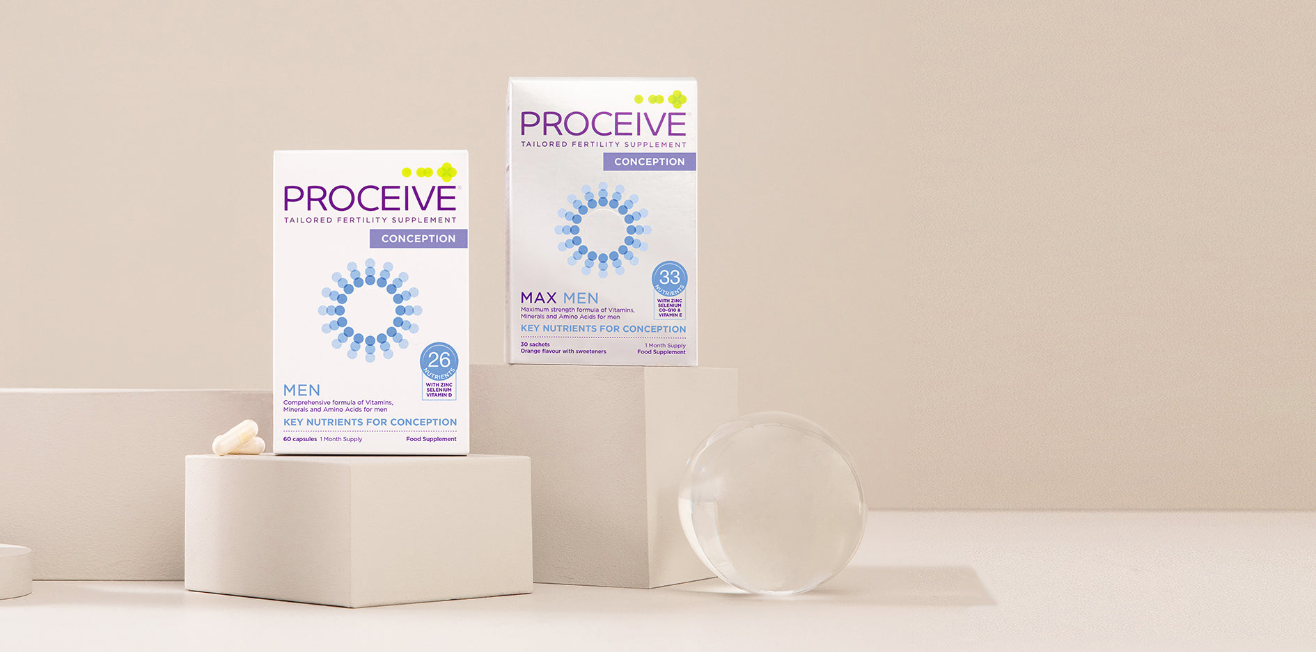 - Proceive® Max Men: Provides 3,441mg of active nutrition per daily dose. The higher nutrient levels are based on scientific research indicating that men over 40 or those TTC for more than 12 months benefit from additional nutritional support.