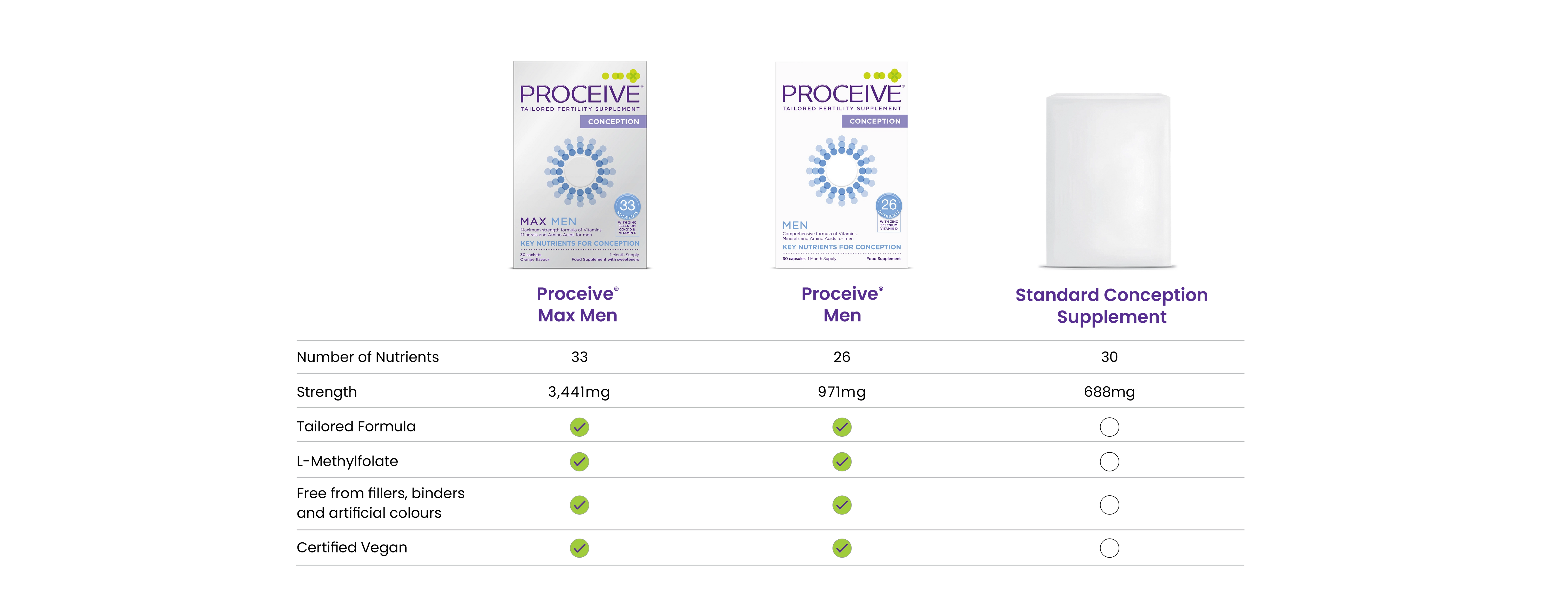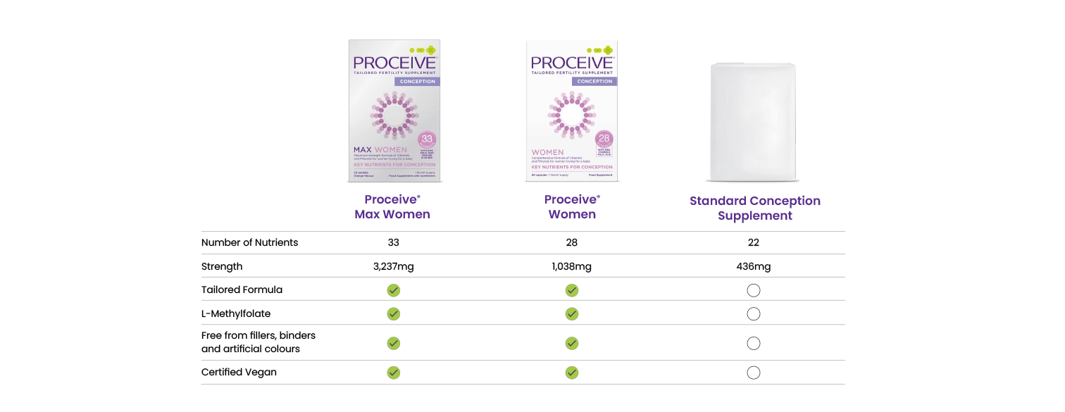 When trying to conceive and while pregnant its important to eat a clean, healthy, balanced diet, and so we believe that only the purest, active nutrients should go into our products and nothing else. That’s why you won’t find any fillers, binders or preservatives in the Proceive® range.